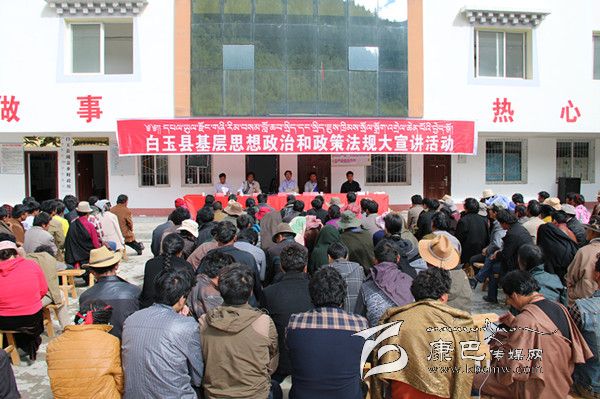 ?。冈碌陌子?,烈日當(dāng)頭,秋高氣爽。31日上午,絨蓋鄉(xiāng)政府大院內(nèi),白玉縣基層思想政治和政策法規(guī)大宣講活動(dòng)正在這里精彩“上演”,400多名前來“聽課”的各村群眾正津津有味地品味著縣宣講團(tuán)成員松吉尼瑪通俗易懂的藏語大宣講。從黨的十八大到十八屆三中全會(huì)精神,從糧食直補(bǔ)到低保、新農(nóng)保,從養(yǎng)老保險(xiǎn)、殘疾人幫扶到相關(guān)法律法規(guī),宣講者深入淺出,傾聽者全神貫注。