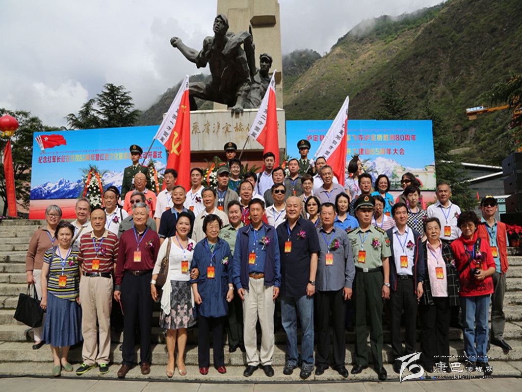 紅軍后代和原第十八軍官兵代表,飛奪瀘定橋二十二勇士親屬代表在紀(jì)念碑前合影。