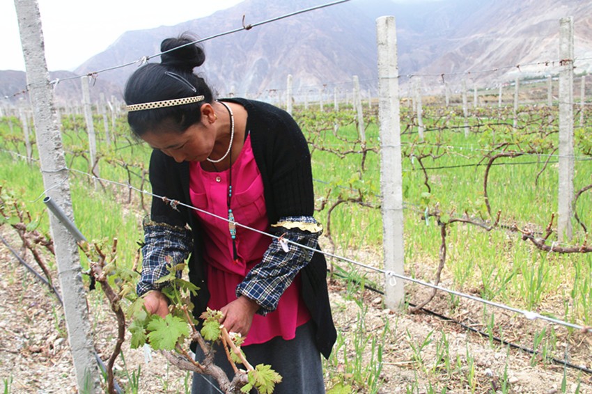 四郎吉村地處半山腰,干旱缺水、土地貧瘠,村民們以前都靠種植青稞來獲得收入?!斑^去,由于缺技術(shù)、葡萄的品質(zhì)不高,我家種的釀酒葡萄賣不出去;現(xiàn)在,太陽魂公司承包了村民們的葡萄園,成立專業(yè)合作社,統(tǒng)一種植、統(tǒng)一管理、統(tǒng)一經(jīng)營(yíng),既規(guī)避了風(fēng)險(xiǎn),又為大家?guī)砹撕芎玫慕?jīng)濟(jì)效益?!睂?duì)于村民仁青志瑪來說,生活的好轉(zhuǎn)都起因于小小的葡萄。
