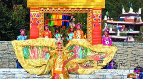 在催人奮進的戰(zhàn)鼓聲中,一群身披甲胄的士兵拿著長劍,背著巨弓走到臺前,在鏗鏘的戰(zhàn)鼓聲中,戰(zhàn)士們做著各種競技動作,模仿武士們互相攻擊的樣子,那矯健的身影展示了遠(yuǎn)古時代嘉絨藏族先民們?yōu)榱松媾c自然努力抗?fàn)幍膱鼍?。過了一會兒音樂一轉(zhuǎn),戰(zhàn)鼓聲漸漸減弱,在鳥雀的陣陣啾啾聲中,一座木門慢慢的開啟,一位身披長袍、頭戴鳳冠的女王在眾多美女的簇?fù)硐?,緩緩走下臺階步入舞臺中央,此時,一位手捧托盤的老者來到女王面前單膝下跪,將托盤高舉過頂,并邀請女王品嘗佳肴,女王將中指在酒中蘸了蘸,并曲起中指向四周輕輕彈去,寓意愿將杯中美酒與四方百姓同飲。在女王面前還放置著一個凈水桶,桶中盛滿了清澈的甘泉,桶上橫放著一枝柏樹枝,女王伸出纖纖玉手,拿著柏樹枝在水中蘸了蘸,面向墨爾多神山撒去,寓意向神山祈福。這是此次《美人谷·丹巴》節(jié)目展演中的序曲部分,有著強烈的東女神韻,將遠(yuǎn)古時代東女國女王遺風(fēng)展演的淋漓盡致。