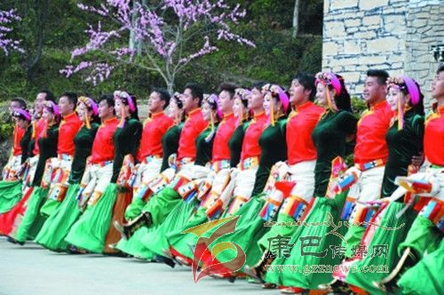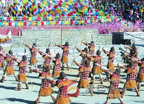 10月26日,在甲居藏寨,處處洋溢著豐收和歡樂的氣氛,人們扶老攜幼,身著節(jié)日的盛裝走到一起,來共同慶祝丹巴嘉絨風(fēng)情節(jié)的順利召開。在一塊空地中,搭建了臨時的舞臺,看臺上,幾座古碉模型傲然挺立,在不遠(yuǎn)處,一座古碉矗立在一座小山包上,與古碉模型遙相呼應(yīng)、相映成趣。上午9時40分,當(dāng)節(jié)目主持人宣布嘉絨風(fēng)情節(jié)正式開始時,一束束搖曳的煙花向空中飛去,在空中炸響后,散發(fā)出五顏六色的煙霧,其中有的還幻化成幾多小小的降落傘,就像多多盛開的鮮花在空中綻放。演出現(xiàn)場前的大地和遠(yuǎn)處的小山坡上到處都站滿了熱情的觀眾,合著禮花的爆裂時的響聲,將手中的小紅旗展開,高舉過頭頂,有節(jié)奏的左右搖動,霎時間,整個現(xiàn)場成為了紅色的海洋。