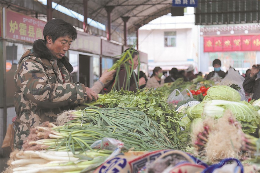 農(nóng)貿(mào)市場貨源充足,市民正在采購蔬菜。