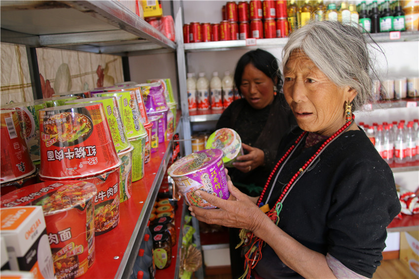 貨架上的貨物琳瑯滿目,價格與縣城大超市一分不差,還節(jié)省了路途奔波?!凹议T口就能買到東西,還又好又便宜,安逸。開展精準(zhǔn)扶貧,硬是為大家解決了大困難。” 村民格瑪拉措道出了村民們的感激。大家共同商議決定把這超市叫做“洛蝦村感恩超市”。