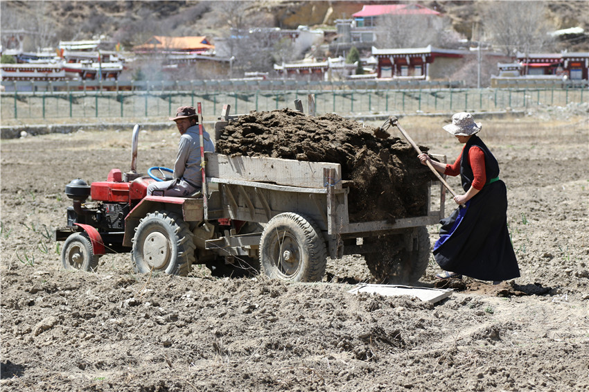 一大早,村民絨布夫婦將去年收集曬干的一袋袋牛糞裝在拖拉機(jī)上,開(kāi)著拖拉機(jī)駛向自己的3畝地旁。絨布緩慢的提起液壓操作桿至45度,妻子擁青在后面用鏟子將牛糞灑在沉睡了一冬的土地上,空氣中彌漫著一股淡淡的牛糞味。