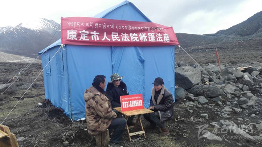康定市人民法院把巡回法庭搬上山, 在一個簡陋的帳篷外,法律服務(wù)站(點)設(shè)在值勤點,一手抓穩(wěn)定、一手抓審判?!皫づ穹ㄍァ钡姆ü僭诖迕窦议T口審案子,把嚴肅的法理融入知心話告訴當事人,拉近與當事人間的距離,更易于化解矛盾。農(nóng)牧民群眾在春播秋收季節(jié)、蟲草采挖季節(jié)和冬季牧場搬遷時往往忙于勞作,很難抽出時間到法院參加訴訟,因此影響了他們通過司法途徑維護自己的合法權(quán)益。采用“帳篷法庭”、巡回審理的方式就地辦案,及時調(diào)處矛盾糾紛,為群眾提供了便捷的司法服務(wù)。