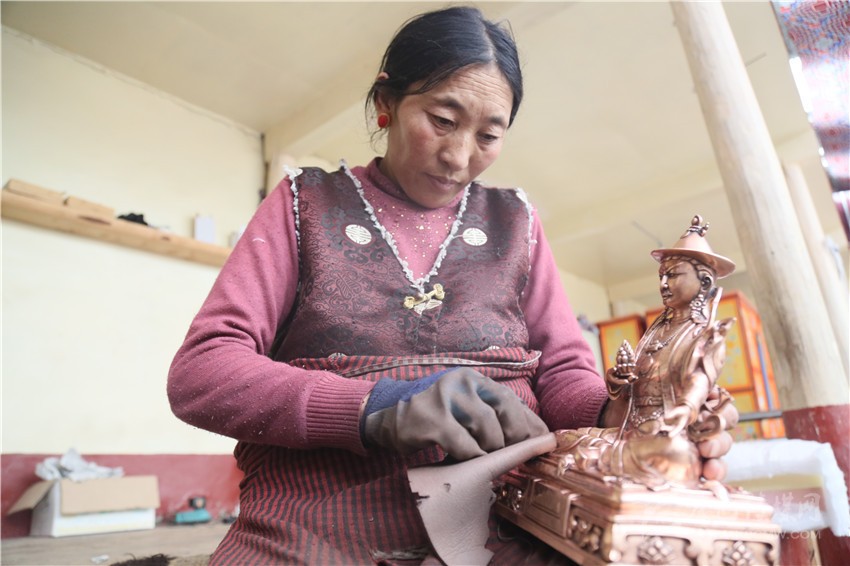 一雙粗糙而靈巧的手正一絲不茍地對銅像進行最后的打磨。這是一雙執(zhí)著于銅鑄工藝43年的手。尼瑪從7歲開始學習銅鑄手藝,是該項工藝的州級非物質(zhì)文化傳承人。