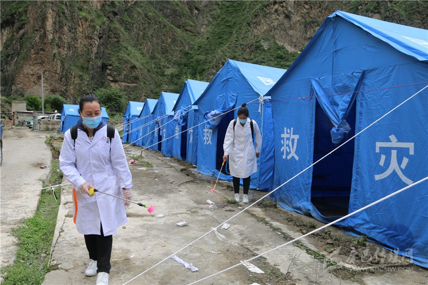 丹巴縣衛(wèi)生系統(tǒng)工作人員在臨時(shí)安置點(diǎn)開(kāi)展消殺工作。