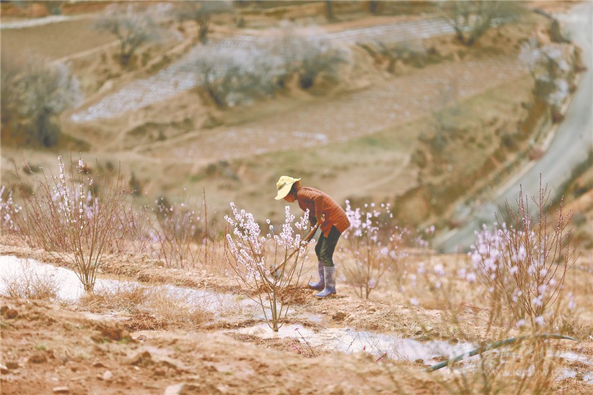 “情緣桃林”四個大字鑲嵌在半山腰,成片的桃林井然有序地排列在3000畝土地上,猶如沙場點兵,十分壯觀。