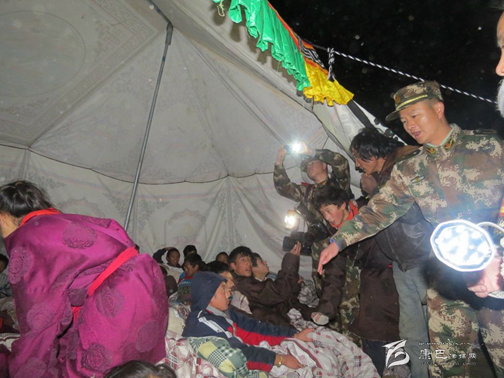 凌晨1時,在江巴村,60名官兵挨家挨戶搜救轉(zhuǎn)移群眾,連夜搭建救災(zāi)帳篷。“同志,我的小女兒拉姆找不著了,可能埋在房子里了……”澤仁阿巴急匆匆地拉著武警戰(zhàn)士的手求援,“你家在哪里?快帶我們?nèi)ィ?rdquo;未等四十歲的澤仁阿巴說完,官兵們奔向不遠(yuǎn)處的一堆倒塌的房屋。考慮到有人埋在下面,官兵們不敢用鎬刨用鍬鏟,在另一面墻上石片不停掉落的情況下,仍然紛紛撲下身子扒拉土石結(jié)構(gòu)的殘垣斷壁,最終在兩個木箱中間找到了已哭成淚人的小拉姆,所幸6歲的拉姆安然無恙。