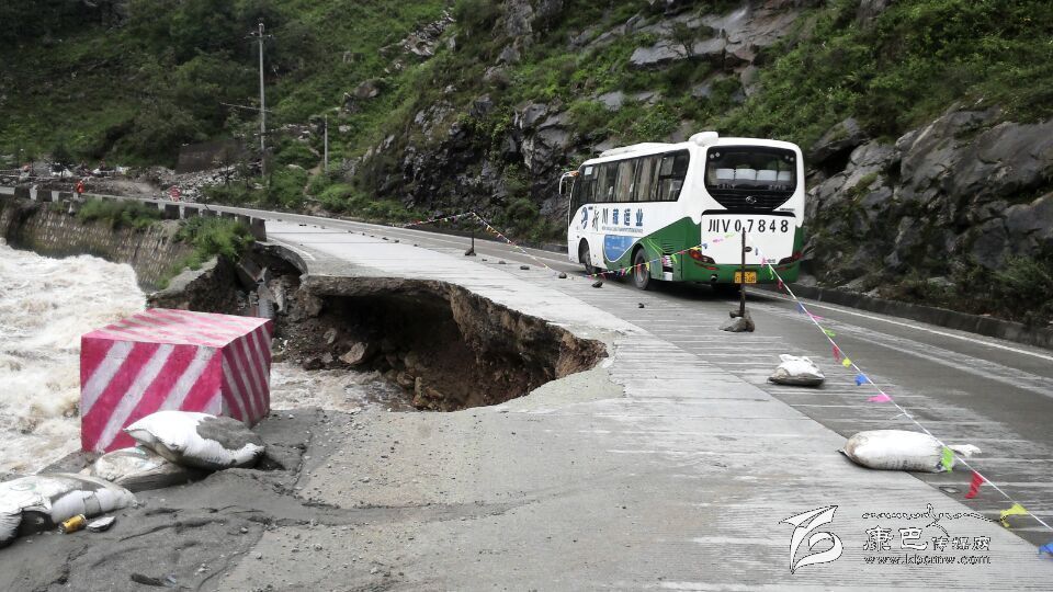 本網(wǎng)訊 (鄧翰卿 賀淑明文/圖)由于連降暴雨,折多河暴發(fā)山洪。9月17日上午7時20分,瀘定公路分局瓦斯溝養(yǎng)護(hù)站在道路巡查中發(fā)現(xiàn)國道318線二康路小天都路段K2824+800處路基被山洪沖毀,形成缺口。發(fā)現(xiàn)險情后,該分局第一時間組織人員對危險路段實(shí)行交通管制,安排專人負(fù)責(zé)在缺口上、下方向提示過往行人及車輛,并及時擬定應(yīng)急搶險方案。截止目前,路基右側(cè)被沖毀路段長達(dá)45米,寬5.9米,路基被水漩空,道路混凝土面層懸空15米,僅左側(cè)車道勉強(qiáng)通行。因水流湍急,不利于及時恢復(fù)路基,目前該路段已實(shí)行交通管制,該分局提示過往車輛觀察、緩慢通行水毀路段。