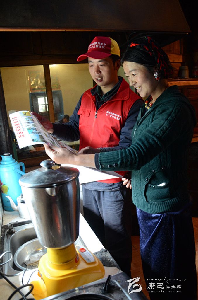 告別學(xué)校的同學(xué)們,新都橋供電所的工作人員又趕向下一個(gè)地點(diǎn)——瓦澤鄉(xiāng)營(yíng)官村。走進(jìn)一戶農(nóng)民的家里,女主人汪修卓瑪正在用打茶機(jī)制作酥油茶,打茶機(jī)旁的電爐上一個(gè)水壺正在咕嚕咕嚕地冒著熱氣。工作人員趕緊走上去關(guān)掉電爐,并告訴汪修卓瑪:“你們平時(shí)使用電爐等家用電器要注意安全,水特別容易導(dǎo)電,水開(kāi)了要及時(shí)關(guān)掉電爐,使用打茶機(jī)時(shí)要先擦干外殼和底部的水……”