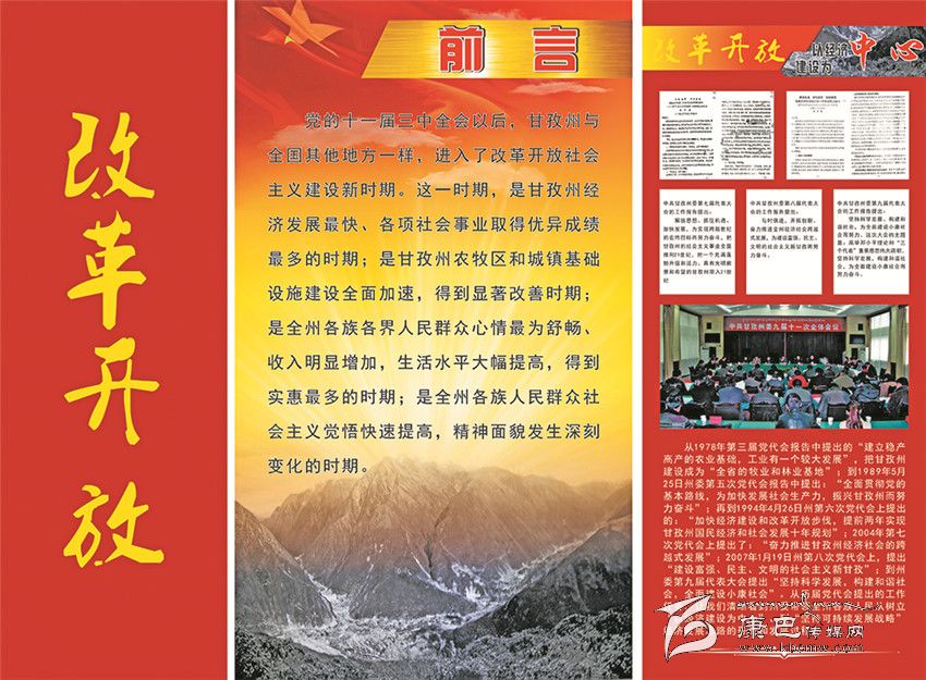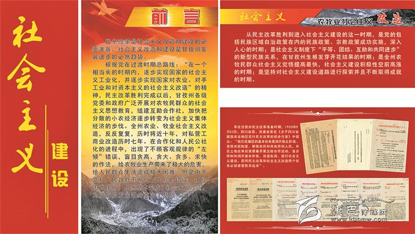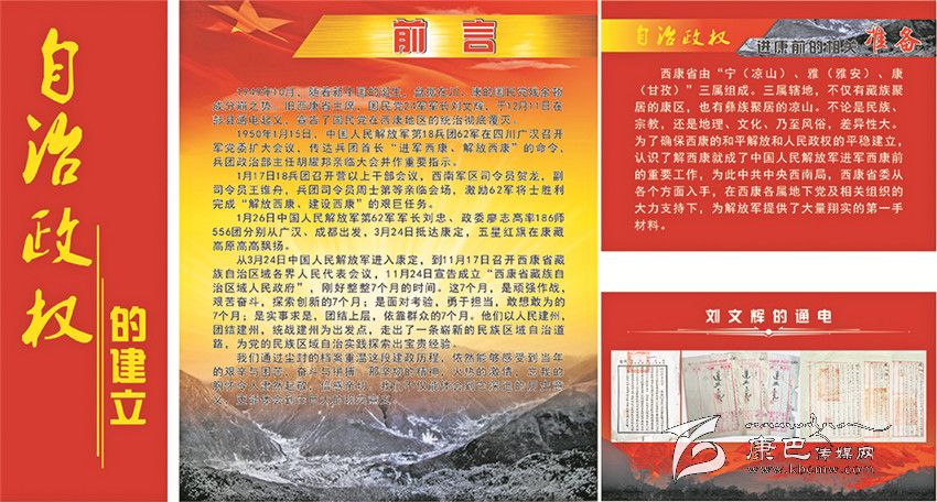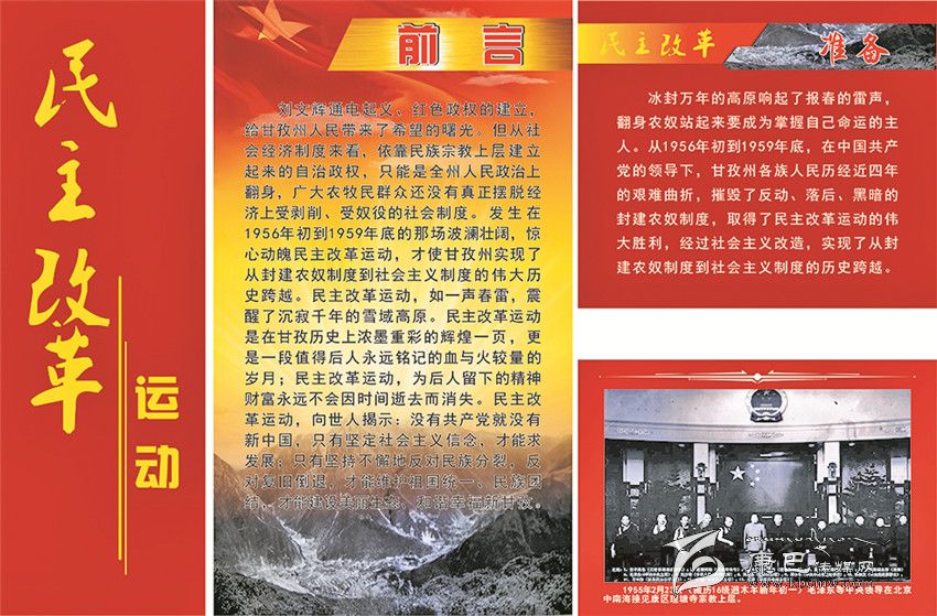 《甘孜州檔案館愛(ài)國(guó)主義教育基地》的整個(gè)展覽分為四大板塊。第一部分命名為“自治政權(quán)的建立”,向參觀者介紹了甘孜藏族自治州誕生的歷史過(guò)程;第二部分是“民主改革運(yùn)動(dòng)”,把人們帶回了那段不能忘記的烽火歲月;第三部分是“社會(huì)主義建設(shè)”,深情地回顧了在建設(shè)社會(huì)主義事業(yè)中我州所取得的不平凡的成就;第四部分是“改革開放”,讓人們重溫了在改革開放的大潮中所經(jīng)歷的那些充滿激情的經(jīng)歷。