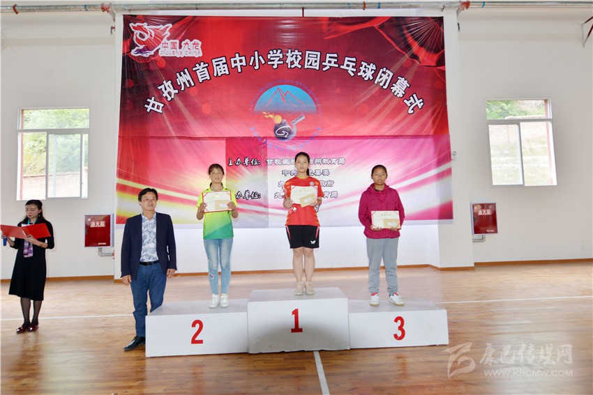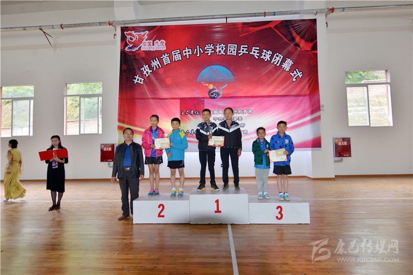 閉幕式上,乒乓球裁判長向全體運動員宣布:甘孜州首屆校園乒乓球賽圓滿結(jié)束,此次比賽成績真實有效,符合賽事組委會預(yù)先制定的競賽規(guī)則。周敏吉、邱志明、唐定成、翁義分別為獲得小學(xué)組、初中組、高中(中職)組獲得女單、男單、混合雙打前三名的運動員頒獎。