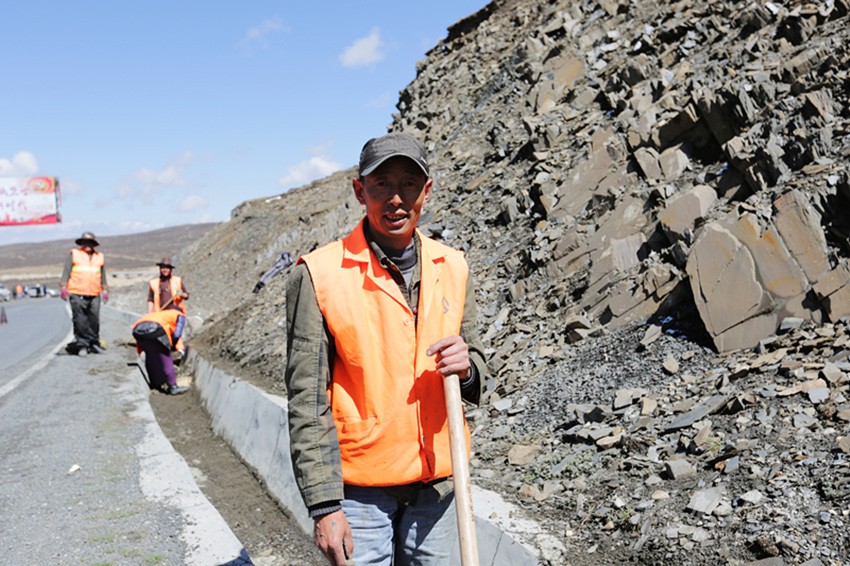 劉德貴正在折多山上養(yǎng)護(hù)公路。