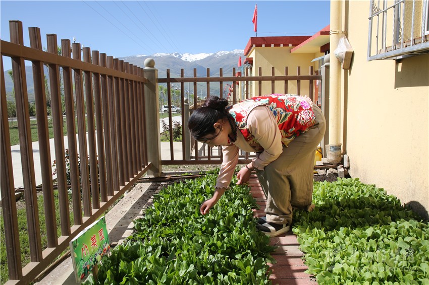 安置點(diǎn)村民在小菜園摘菜。