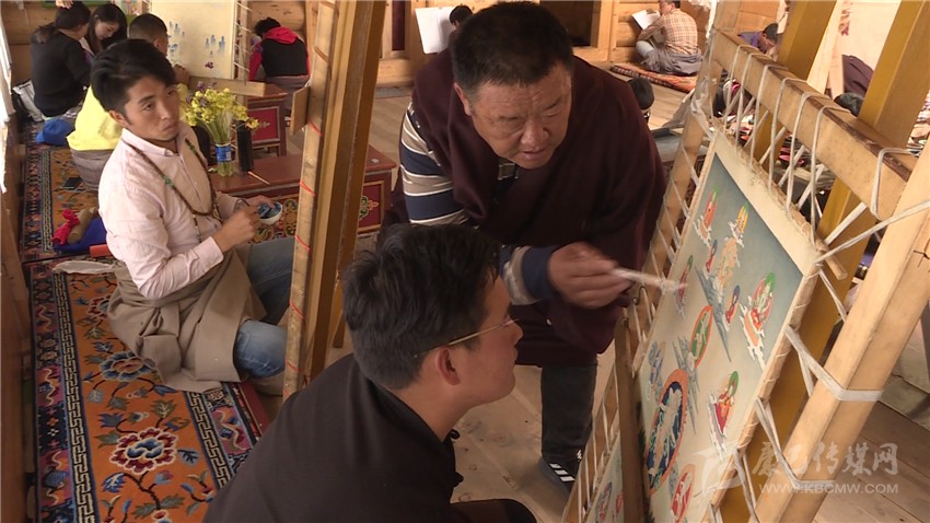 深山蘊古韻,妙筆繪丹青。7月19日,德格,八幫,達瑪嘎拉藝術(shù)學院,畫框面前,一位慈祥的老人正在執(zhí)手相授,一絲不茍地為學生作唐卡繪畫示范。