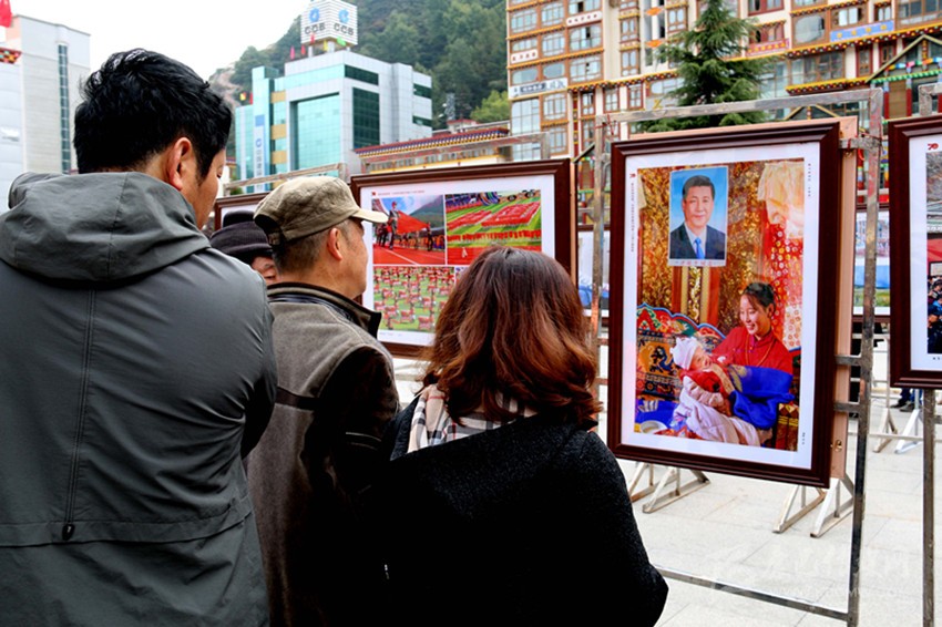 市民正在觀看“大美甘孜——慶祝中華人民共和國成立70周年攝影展“作品《趕上好時代》。