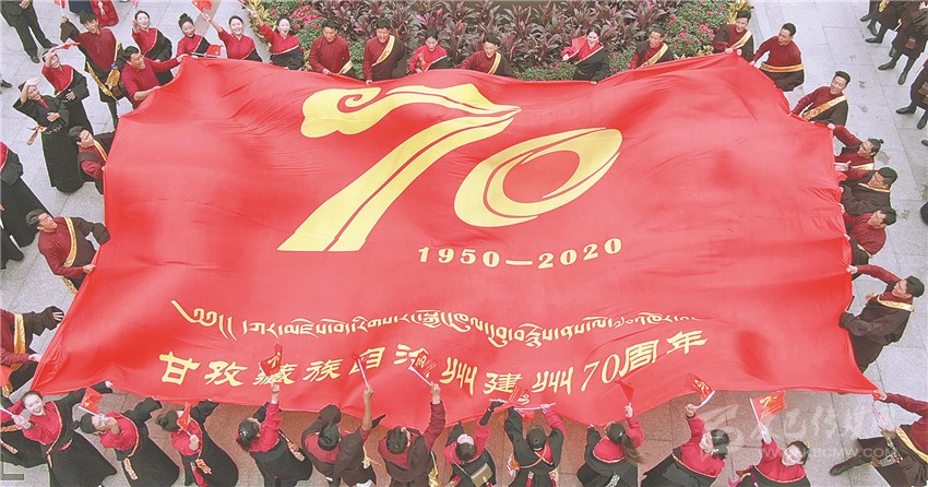 美妙的歌聲縈繞四方,鮮艷的旗幟迎風(fēng)飄揚(yáng)。就在眾人忘情高歌之時(shí),來自州歌舞團(tuán)的50多名演員將一面巨大的印有“建州70年Logo”的紅旗,在廣場(chǎng)正中鋪展開來。以這面旗幟為中心,先后到來的人們組成了三個(gè)同心圓,用歌聲禮贊甘孜州建州70周年。