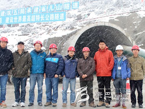 援藏干部陳廣冒雪在雀兒山隧道督查(居中為陳廣)。