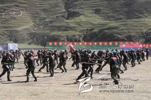 在實(shí)戰(zhàn)技能演練中,各單位都表演了自己的拿手絕技:由武警甘孜州支隊(duì)雪山飛虎隊(duì)20名官兵演練的特種射擊;武警四川總隊(duì)第二支隊(duì)演練的格斗術(shù);中國人民解放軍甘孜軍分區(qū)獨(dú)立營120名官兵演練刺殺操;武警甘孜支隊(duì)一大隊(duì)和三大隊(duì)200名官兵演練的防暴對(duì)抗;雪山飛虎隊(duì)隊(duì)員帶來的硬功表演;州公安局特警支隊(duì)特警演練的“雪狼十七式”、摔擒配套動(dòng)作、實(shí)戰(zhàn)對(duì)抗。據(jù)了解,“雪狼十七式”是甘孜公安特警通過六年來在高原維穩(wěn)駐訓(xùn)、處置突發(fā)事件,摸索出來的摔擒動(dòng)作,具有極強(qiáng)的殺傷力,能瞬間制敵。它是我州特警隊(duì)員實(shí)戰(zhàn)中克敵制勝的法寶,是特警隊(duì)員必備的基本功。