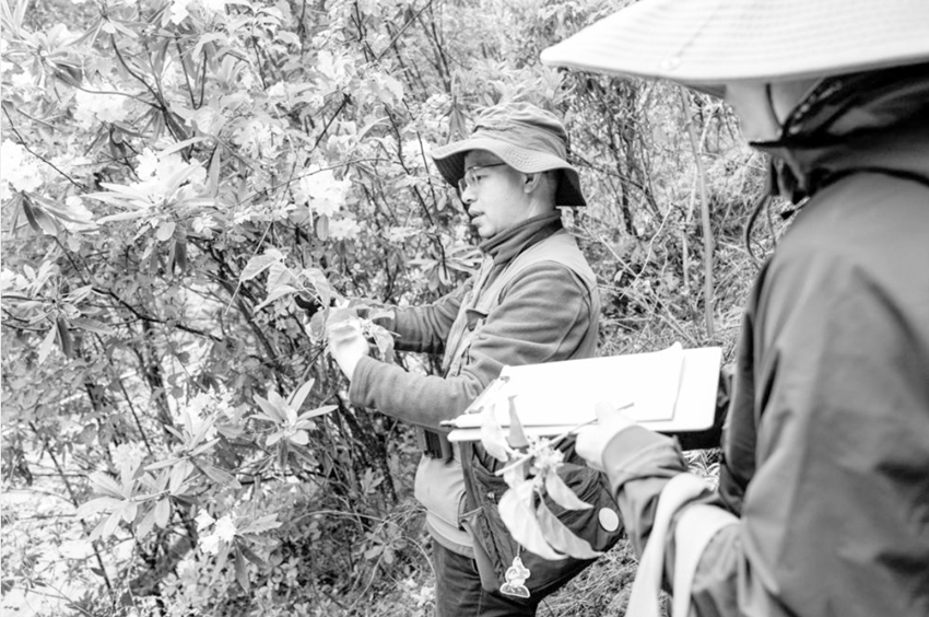 回到山腳,張遠(yuǎn)彬正在打開植物“盲盒”。“這里海拔差別大,杜鵑的種類特別多,這是以前沒(méi)有記錄到的?!睆堖h(yuǎn)彬直呼“驚喜”,邊用手機(jī)拍下形態(tài),邊口述特征讓一旁的助手記錄。