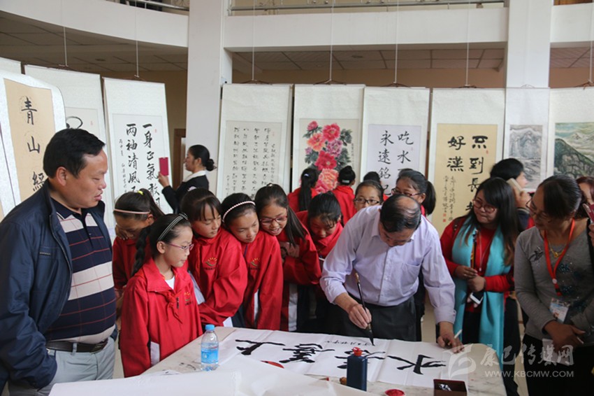 “五老”送書(shū)畫(huà)進(jìn)校園。