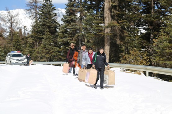 因近日天氣變化浪中村路面積雪過多,工作組棄車步行手提贈送物資前往浪中村,到達浪中村后,工作組了解結(jié)對戶生產(chǎn)生活情況、贈送棉被并向村民宣講脫貧攻堅政策。