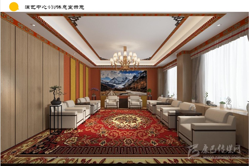 藏式繪畫、門板藏式浮雕造型、藏式鼓架、展示康定城的浮雕........記者看到,效果圖中農(nóng)牧民演藝中心的設(shè)計充滿了“傳統(tǒng)文化”的味道。頂部設(shè)計利用了線條的柔韌性和律動性,使空間更有線條感,看起來像康定的潺潺河流,墻面分別使用樂器、山巒疊成的變化形式,營造出獨特的民族風(fēng)情。通過自熱和人文的結(jié)合展示出康定人民樂觀向上、民族團結(jié)的和樂畫面。地面設(shè)計采用了暖(冷)色座椅與富有民族特色的色彩搭配,營造出一種身處藏家,暢游藏文化海洋的意境。