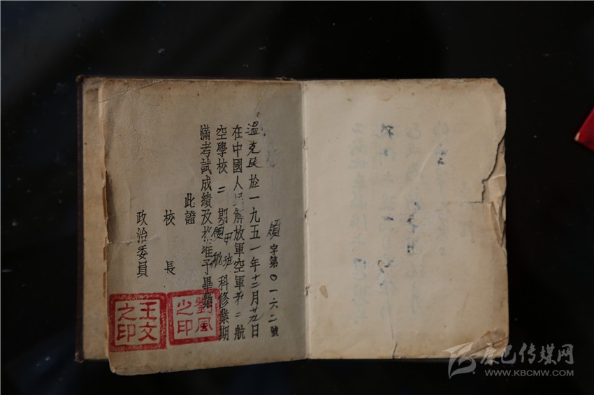 溫克棟的大兒子、57歲的溫樹(shù)平拿出大伯留下的遺物——一本中國(guó)人民解放軍航空學(xué)校畢業(yè)證書、一本中國(guó)人民解放軍空軍后勤部發(fā)的飛行裝具證、一本《中國(guó)共產(chǎn)黨黨章》、一本《中國(guó)人民政治協(xié)商會(huì)議共同綱領(lǐng)》,四本珍貴的文物書頁(yè)發(fā)黃,有的還有些微殘缺,但卻是珍貴的歷史見(jiàn)證物,溫家視為傳家寶。