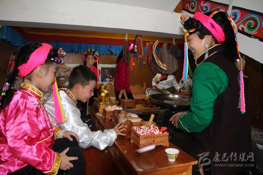 筆者正在參觀時(shí),老師帶領(lǐng)著一群可愛的孩童走進(jìn)鍋莊房?jī)?nèi)。孩子們脫下鞋襪,盤膝坐在藏床上,一邊做著喝酥油茶的樣子,一邊唱起古老的嘉絨歌謠。稚嫩的嗓音中,遠(yuǎn)古文化煥發(fā)出新時(shí)期的獨(dú)特魅力。老師則坐在火籠邊,不斷地“忙碌”著。孩子們“吃飽喝足”后,走到房屋主人的扮演者老師面前鞠躬致謝,文明禮儀也得到了升華。