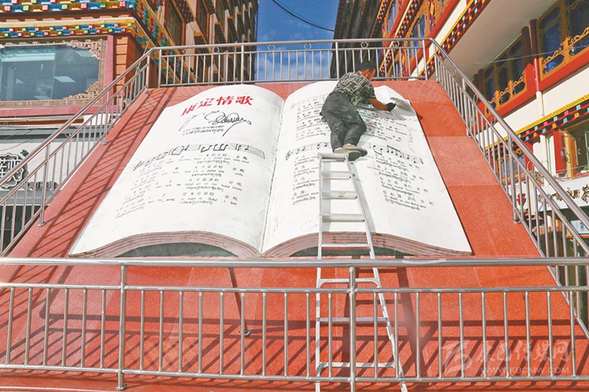 本網(wǎng)訊 8月14日,康定市情歌廣場(chǎng),工人正在對(duì)“康定情歌”雕塑的“詞曲”進(jìn)行補(bǔ)填。一首《康定情歌》,是世界的情歌;因?yàn)橐皇浊楦?,康定成為情歌的世界??刀ㄊ惺姓芾砭止ぷ魅藛T介紹,設(shè)立在情歌廣場(chǎng)的《康定情歌》雕塑是外來游客的必看“景觀”,因?yàn)轱L(fēng)雨剝蝕,詞和曲有些模糊不清,必須進(jìn)行修補(bǔ)?,F(xiàn)對(duì)詞曲進(jìn)行填補(bǔ)著色,讓雕塑以嶄新面貌、讓康定以良好城市形象迎迓四方來客。