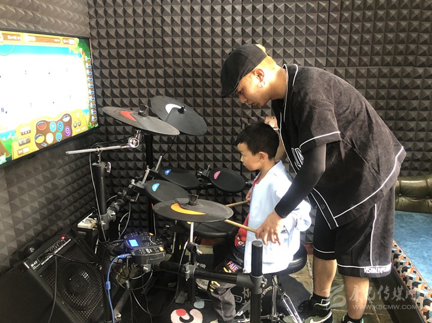 何丞峰正在老師的指導(dǎo)下練習(xí)架子鼓。