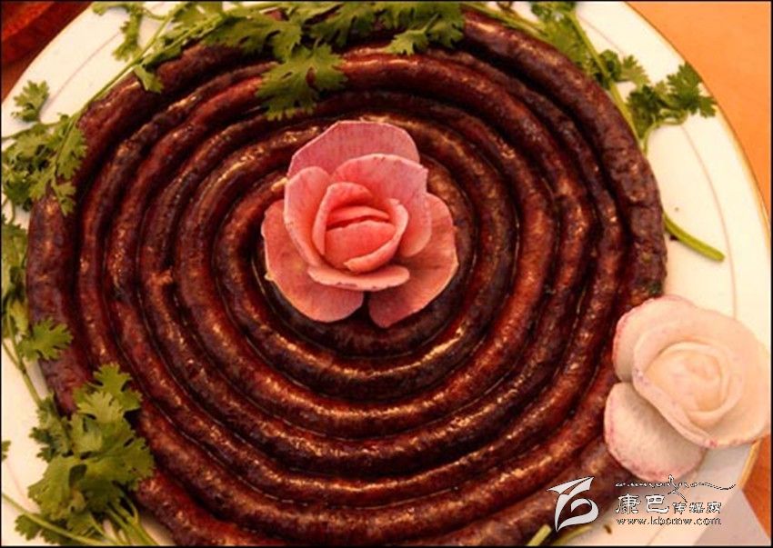 (4)血腸的烹煮,將灌好的血腸,放開湯中煮沸,煮至血腸浮起,腸成灰白色,約八成熟時便起鍋,裝入盤內,全家席地圍坐,割而食之。