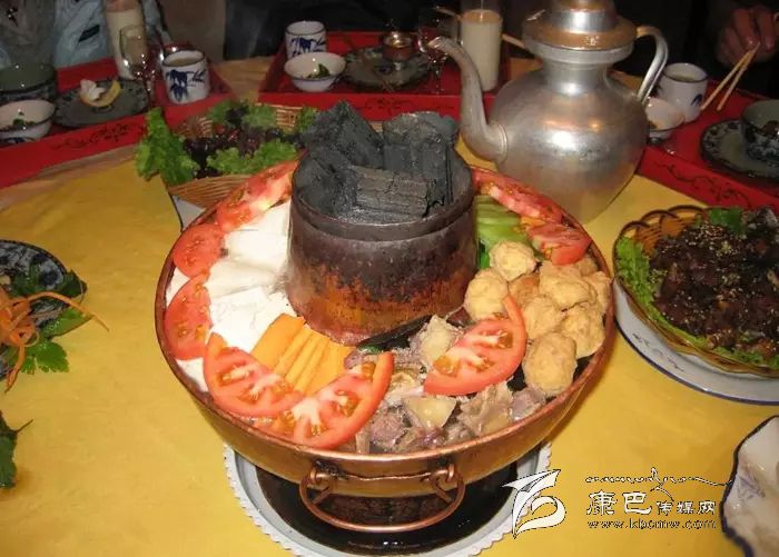 藏式火鍋所用的鍋很像北京的紫銅鍋,但吃法并不像其他的火鍋一樣涮著吃,而是直接把各種菜品一起堆在鍋里,像一座小山丘?;疱伵洳擞?葷4素:牛肉、牛舌、豬肉和肉圓子;胡蘿卜、白蘿卜、萵筍和木耳。湯底都是用牦牛骨頭敖成的清湯,比較清淡,色澤清亮,微微泛著奶白色。湯底的好吃與否是最關(guān)鍵的因素,牦牛骨頭做的湯營養(yǎng)豐富,喝了還不會讓人發(fā)胖。