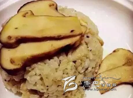 松茸飯:新鮮松茸4個(gè),去泥腳,表面清理后切丁,梗米淘洗,少許黃油煸香松茸丁,加入梗米翻炒2分鐘倒入電飯煲, 電飯煲加水:米 1:1,松茸飯煮熟后倒入少許生抽拌勻即成。