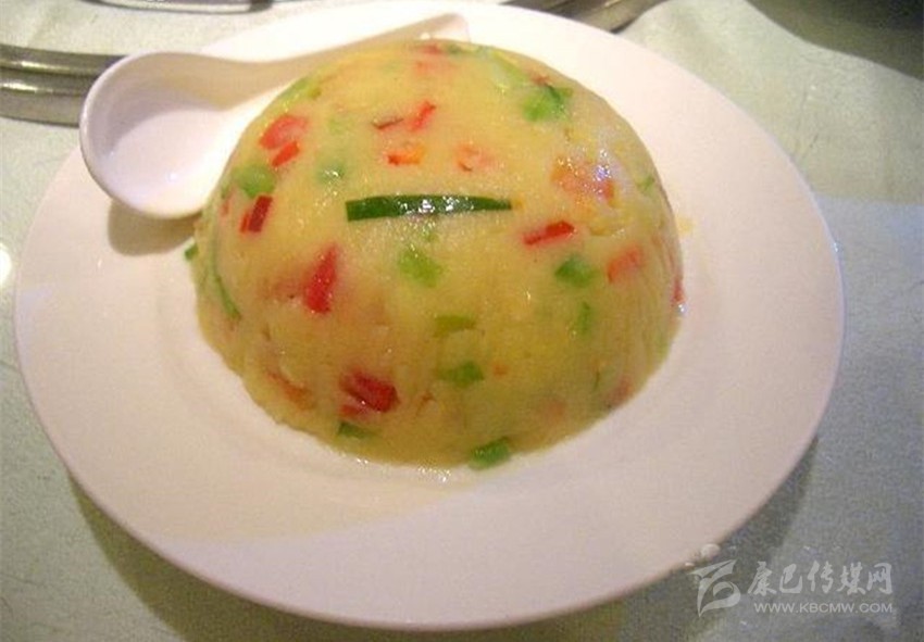 土豆泥,將土豆煮熟,去皮,用湯匙將其壓爛;將青椒剁成顆粒,蒜剁爛,花椒面少許;油溫七成熱,下蒜泥,青椒.花椒面,再下土豆泥;加鹽,味精或雞精,蔥花,起鍋即可。