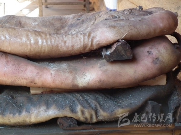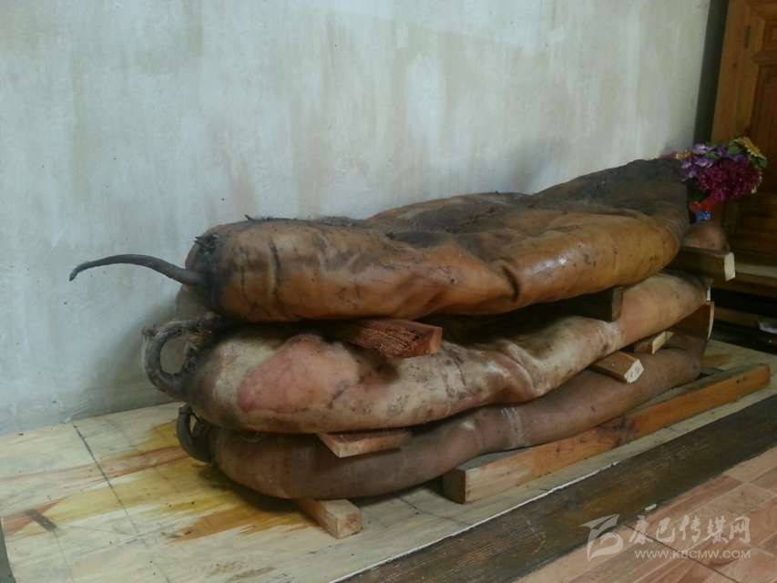 半干豬肉:在丹巴縣革什扎鄉(xiāng)有一種比較奇特的豬肉保存方法:將豬殺死后,不去毛,只在豬的腹部開(kāi)一條口子取出內(nèi)臟,將血水清理干凈后用麻繩將腹部縫合。隨后用當(dāng)?shù)氐狞S泥漿敷在豬身上,在豬的身上形成一個(gè)厚約2厘米的殼,密不透風(fēng)。處理好后將其懸掛于灶塘之上,使黃泥在高溫的烘烤下快速硬化。如若發(fā)現(xiàn)黃泥層出現(xiàn)裂縫,立即用黃泥漿將其修復(fù)。等到第二年熱天時(shí),敲掉黃泥形成的硬殼,豬毛被輕松退去,豬肉依然比較新鮮。但這種保存新鮮豬肉的方法現(xiàn)在已經(jīng)很少見(jiàn)了,一是因?yàn)檫@種保存方法風(fēng)險(xiǎn)太大,稍有不慎豬肉就可能腐敗;二是如今物資供應(yīng)豐富,新鮮豬肉購(gòu)買方便,使得此種儲(chǔ)存方式失去了存在的價(jià)值。