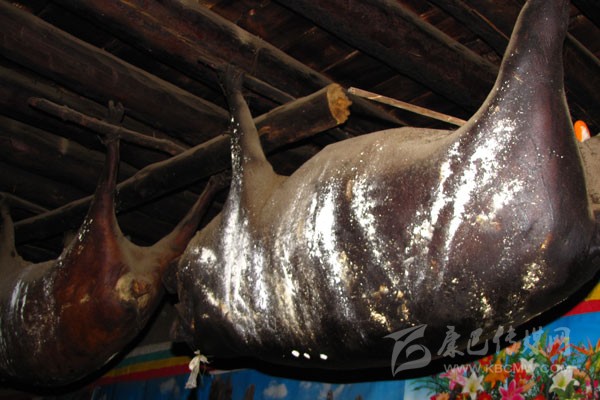 豬膘:在丹巴,豬膘是一種貯存豬肉的方式,是一種飲食習(xí)俗,同時(shí),它又是財(cái)富的象征。在丹巴隨便走進(jìn)一戶人家都可以看到少則幾扇、多則十余扇的豬膘掛在樓上,有些人家的豬膘甚至還貯存十多年之久。這些豬膘大多已經(jīng)被蟲(chóng)吃掉了許多,但是他們也不會(huì)心痛,因?yàn)樵谶^(guò)去,看一個(gè)丹巴人家庭是否富裕,就看他家有多少豬膘,豬膘越多就越富有。
