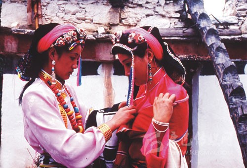 婦女一般不著褲,舉止活動隨時注意長抱下擺齊腳背,不露腿。民主改革以來,多以春秋褲、運動褲穿于袍內(nèi)。